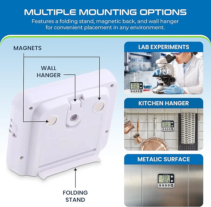 - EASY-TO-READ DISPLAY: Large LCD screen with ¾” digits ensures clear visibility, making it ideal for kitchens, classrooms, and scientific settings.