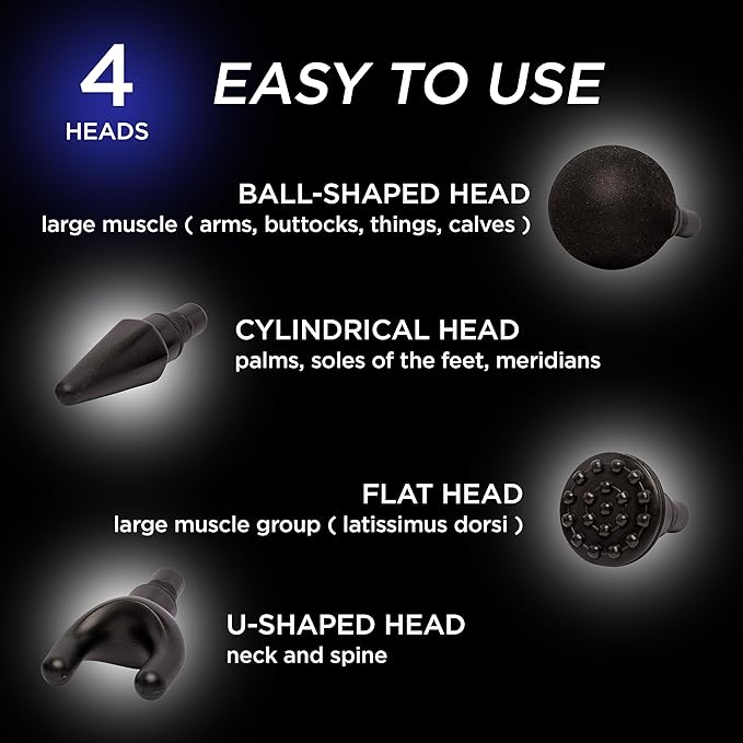 - PERSONALIZED MASSAGE EXPERIENCE with 8 speeds and 4 types of professional massage heads for this muscle massager. From soothing fascia to breaking down lactic acid, effectively target different muscles and areas of tension for soothing pain relief or post workout recovery.