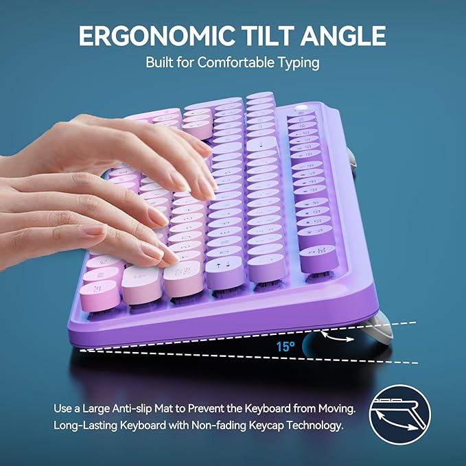 - Special Feature : Auto Sleep Mode, Colorful Typewriter Keyboard, Ergonomic, Foldable Tilt Legs, Round Keycaps