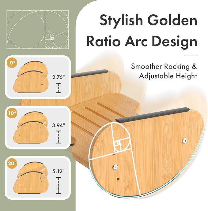 - Adjustable Foot Rest & Built to Last: Crafted from high quality natural bamboo, our under desk footstool is of good durability for long-lasting use and will not break as easily as the plastic one. Non-slip strips added to provide a firm grip and stay put. Golden ratio arc design offers smoother rocking while maintaining a sleek look. You can easily tilt back and forth to find optimal comfort and support