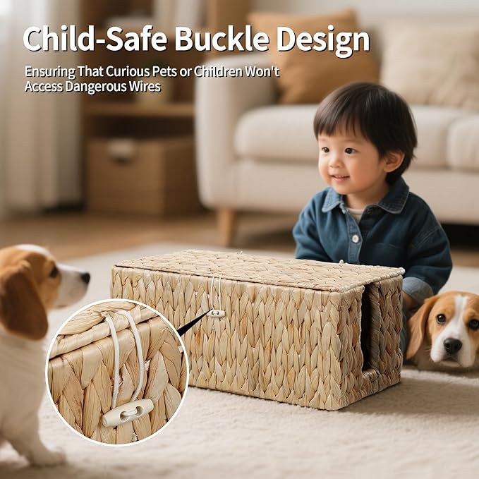 - 【Ensure Family Safety】Keeping your home safe is our priority. The cord hider box features a child-safe design with secure clasps on one side ends, ensuring that curious pets or children won't access dangerous wires. open-weave design allows for proper airflow to prevent overheating of cablesThis cord organizer box provides a secure, safe environment by effectively hiding cables