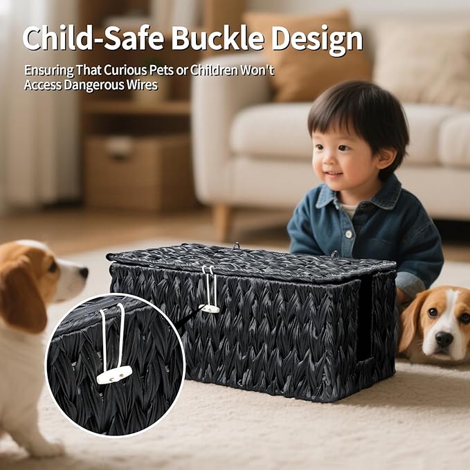 - 【Ensure Family Safety】:Keeping your home safe is our priority. The cord hider box features a child-safe design with secure clasps on one side ends, ensuring that curious pets or children won't access dangerous wires. open-weave design allows for proper airflow to prevent overheating of cablesThis cord organizer box provides a secure, safe environment by effectively hiding cables