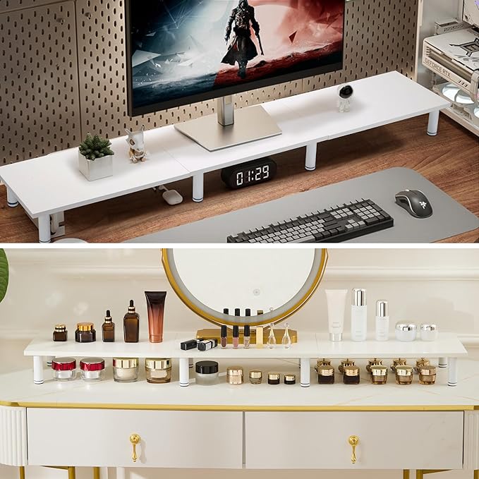 - 【Multifunctional Monitor Riser 】This monitor stand transforms your space into a clutter-free zone, combining sleek design with multi-purpose functionality. Use it as a riser for monitors, laptops, printers, or TVs, or repurpose the spacious surface for makeup organization, pet supplies, or decorative displays. Durable construction ensures stability across all uses, blending seamlessly into home offices, studios, or living areas.