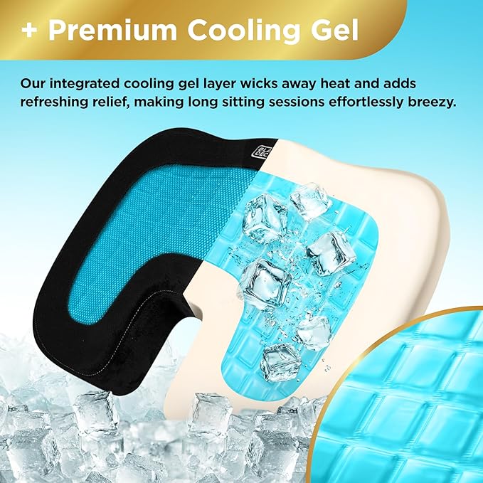 - Cooling Gel & Memory Foam Comfort – Experience superior comfort with a gel-infused memory foam seat cushion that provides contour support and tailbone pain relief while keeping you cool. Size: 17.72 x 13.78 x 2.76 inches.