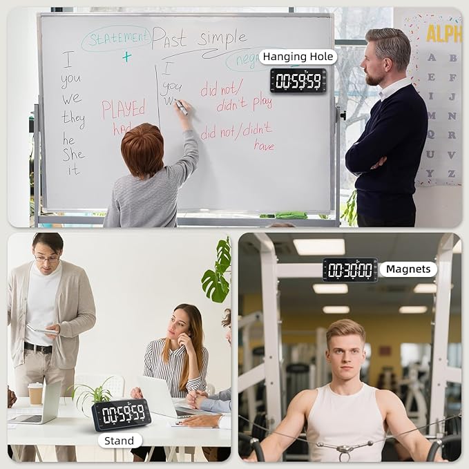 - 【Rechargeable Clock Timer With 3-Level Brightness】The timer features a 3-level dimmer switch—dim the display at night if you’re light-sensitive, as it’s gentle on the eyes. It also has a built-in rechargeable battery with a low-battery icon to remind you when charging is needed (USB-C cable and 5V charger included). Plus, it comes with 4 strong magnets for attaching to metal surfaces, a hook for hanging, and a stand for desktop use
