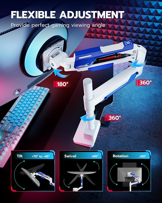 ARES WING Single Monitor Mount, Ultrawide Monitor Arm for 24 to 57 Inch Heavy Duty Curved Screen, Adjustable Gas Spring Monitors Arm Stand up to 66LBS with 75/100/200 Vesa Mount, White