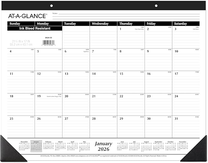 AT-A-GLANCE 2026 Desk Calendar, Monthly, Desk Pad, 21-3/4" x 17", Large, Ruled Blocks (SK240026)