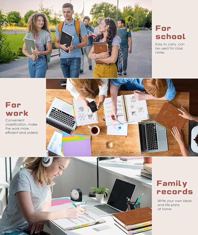- 【Hardcover Notebooks for Work School】This spiral 5 subject notebooks is an excellent choice for students, professionals, or anyone who like to write things down and needs to keep them organized. A stylish look with gold color stamp font, binding brighten up your dreary desk, also a wonderful gift to work organization, back to school or family records.