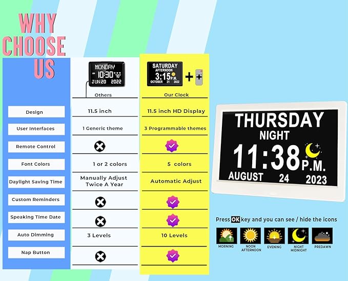 - š®š¬š®š± ššš¦š§ š§ššššš”š ššš¢šš & šš šš¶šš½š¹š®š: Original 11.5-inch 1280x800 HD digital clock Speaks out (English) time, day of the Week, and Date, providing clear voice announcements without any hearing trouble! Backup with a handy remote control. A reliable organizer for dementia seniors or school-age kids