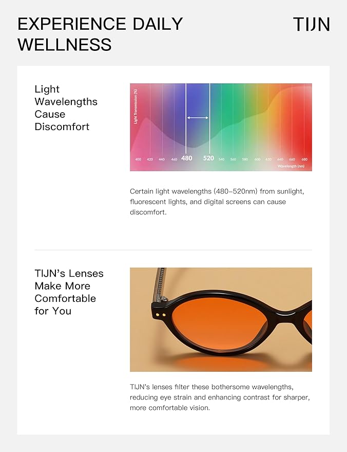 - 【Photophobia Relief Lenses】-Combat digital eye strain with TIJN's Amber Orange lenses - blocks 99% of harmful blue light from screens & LEDs while reducing light sensitivity.Your Migraine solution is here