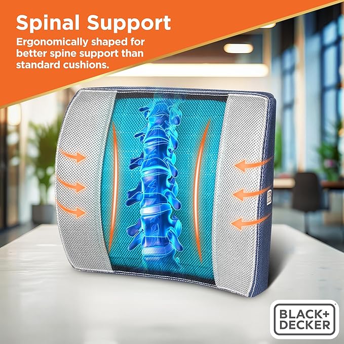 - Ergonomic Lumbar Support for Maximum Comfort – The BLACK+DECKER Cooling Gel Lumbar Memory Foam Cushion provides contoured support to help alleviate lower back pain and promote proper posture, whether you’re working, driving, or relaxing. Dimensions: 13.6 x 12.8 x 4.1 inches.