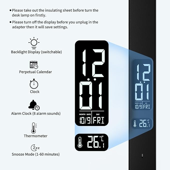 - Smart LED Display: The modern desk lamp features 2 smart LED displays capable of showing time, calendar, alarm with 8 ring tones, and temperature. The lamp with alarm clock includes a DIY snooze function, allowing you to set the snooze time from 1 to 60 minutes. Multiple functions in one desktop lamp to simplify your desk!