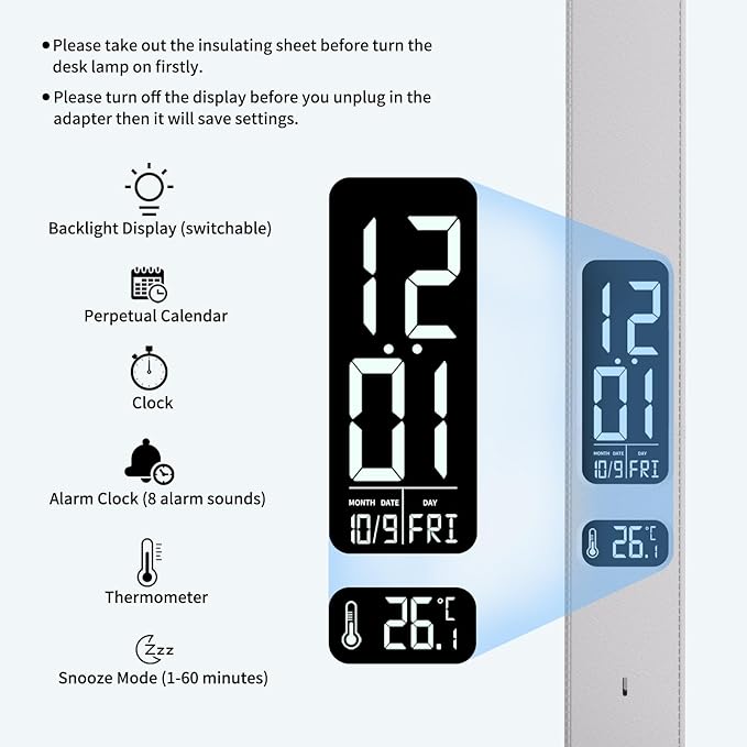 - 【Smart LED Display】The modern desk lamp features 2 smart LED displays capable of showing time, calendar, alarm with 8 ring tones, and temperature. The lamp with alarm clock includes a DIY snooze function, allowing you to set the snooze time from 1 to 60 minutes. Multiple functions in one desktop lamp to simplify your desk!