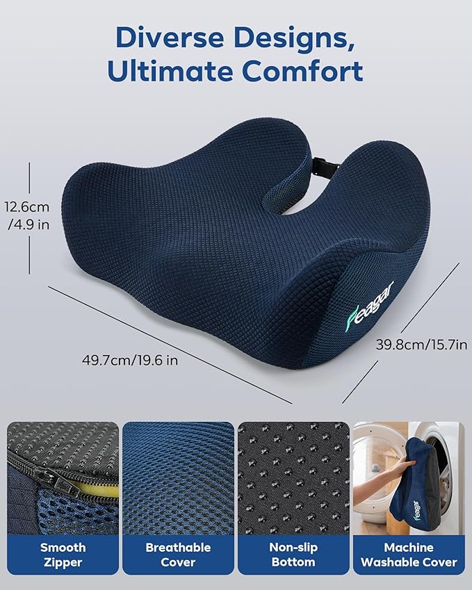 - Premium memory foam & durable construction: Invest in comfort that lasts. The high-density memory foam core is designed to maintain its supportive shape for years, unlike flat and cheap chair cushion options. We've built this coccyx cushion for tailbone pain to be a long-term solution for your daily comfort needs.