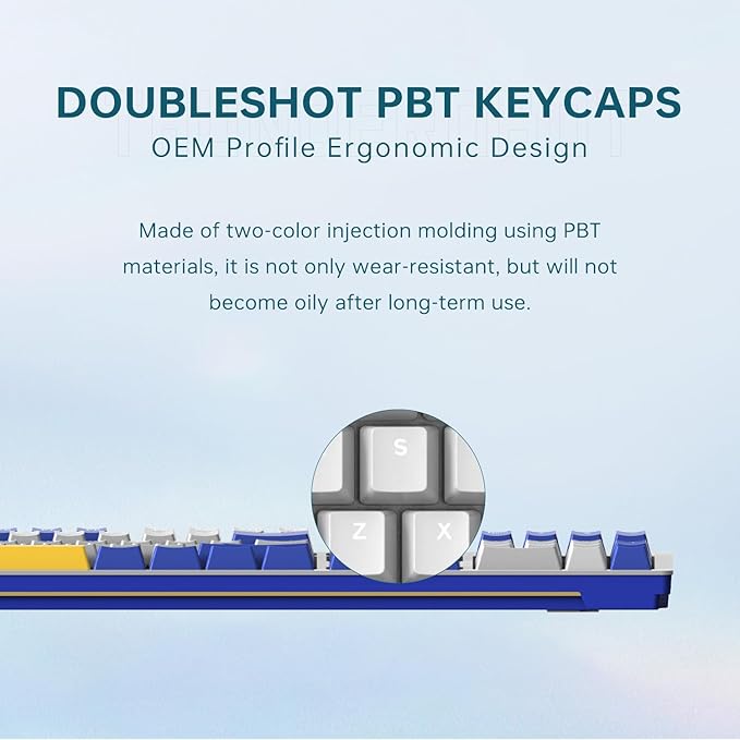 - [Durable PBT Double-Shot Keycaps: Built to Last] Crafted with PBT Double-Shot Injection Molding, these keycaps are highly durable, resistant to fading, and maintain their sharp legends even after prolonged use. The ergonomic profile ensures long-lasting typing comfort and a consistent tactile feel.