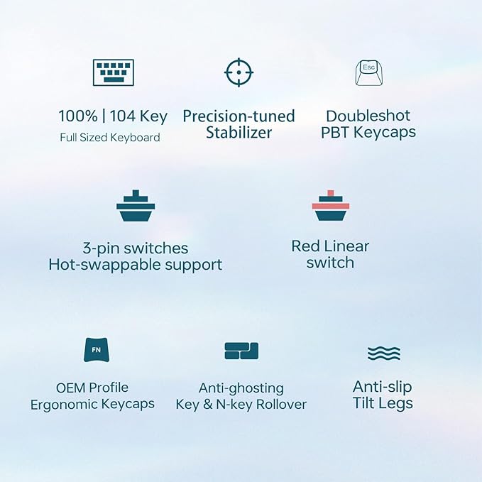 - [Full 104-Key Design: All the Keys You Need] The 104-key layout with full N-Key Rollover ensures that every keystroke is registered accurately, no matter how many keys are pressed simultaneously. Enjoy flawless typing and gaming sessions without missing a single input.