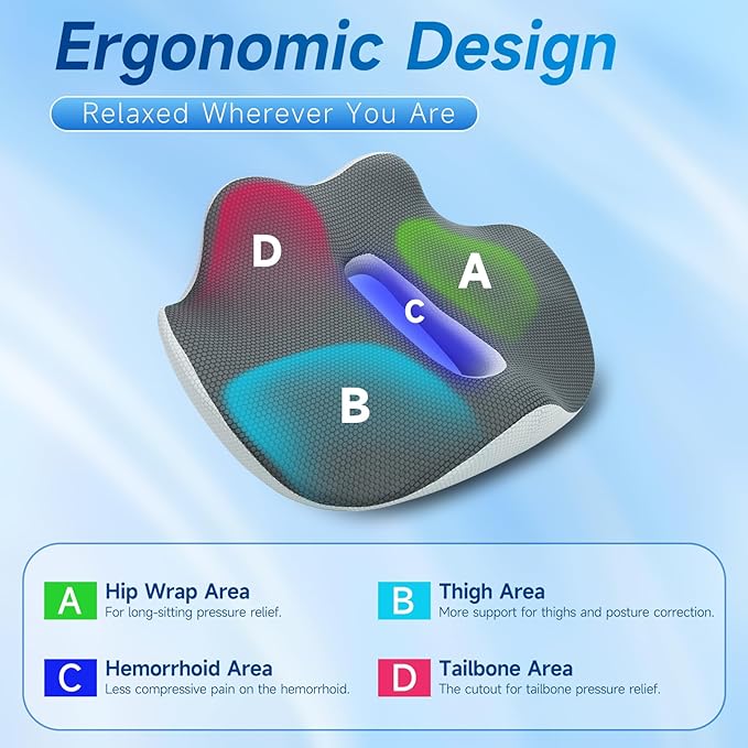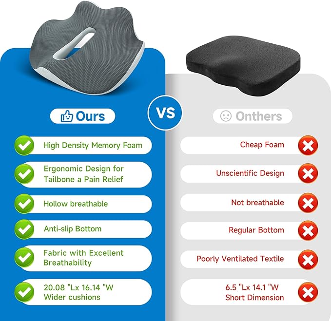 - Ergonomic Relief for Long Drives: This X-Large car seat cushion for long driving is designed to cradle your hips and support your spine during extended trips. With its ergonomic curve and enhanced thickness, this memory foam car seat cushion helps relieve lower back pain, sciatica, and tailbone pressure—ideal as a drivers seat cushion for commuters, truckers, and anyone who sits for long hours.