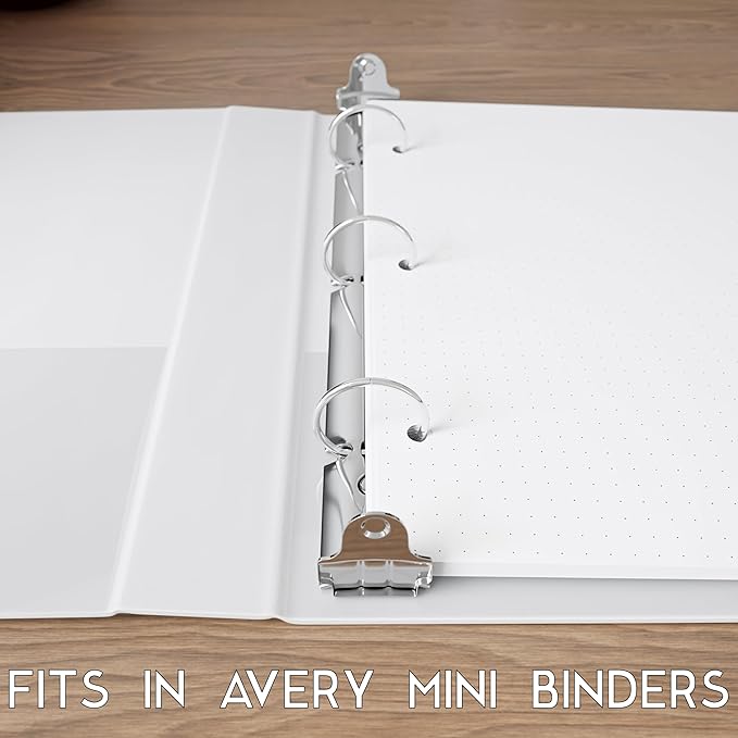 - 3-Hole Pre-Punched Dot Grid Half Letter Paper: This dotted paper comes with the holes already punched and ready to fit inside your 3-ring, half-letter sized mini binder. Compatible with Avery or any mini-size 3-ring binder.