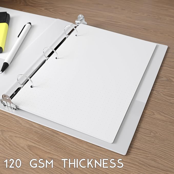 - Paper Stats: 5.5" x 8.5" Half Letter Dot Grid Paper, 120 GSM thickness (equivalent to 32 lb. copy paper), Dot Grid spacing 5mm apart, White, Pre-Punched with three holes, Smooth Finish