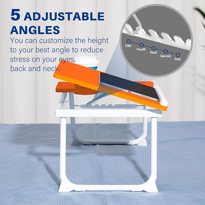 - 【ADJUSTABLE LAPTOP DESK】:This lap desk desktop comes with 5 adjustable tilt angle slots that allow you to customize the height to your perfect angle, reducing the stress on your eyes, back and neck.The desk comes with a cup holder for easy access to water while you work or read in bed.