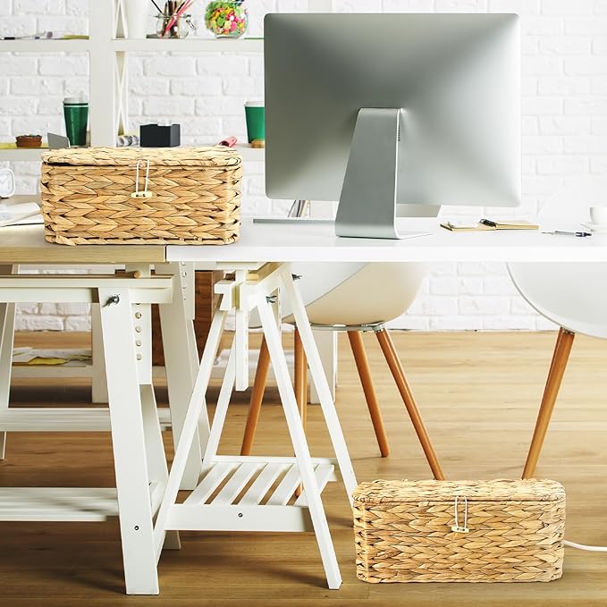 2 Pack Wicker Cable Management Box with Lid, Rattan Cord Organizer Cable Hider Storage Box with 2 Open Slots for Home Office Desk Cord Hider Computer TV Wires USB Hub