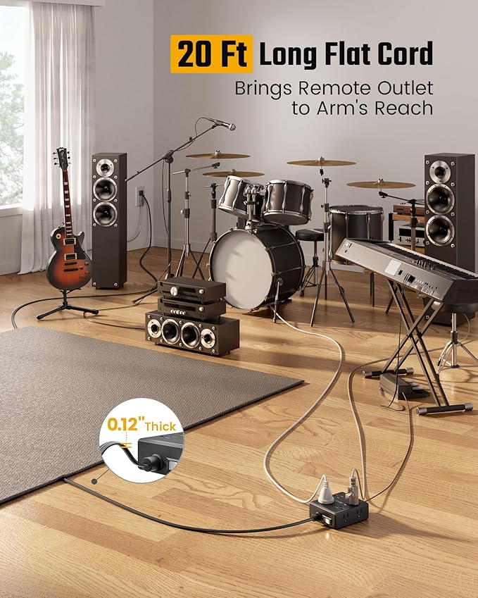 - Long Extension Cord 20 ft: With an ultra thin flat head (only 0.3 inches), our flat plug power strip can easily fit in tight spots and hide behind furniture (sofa / bed / nightstand) with wall-flush alignment; The 45° right angle plug creates extra space for other receptacles below without blocking.