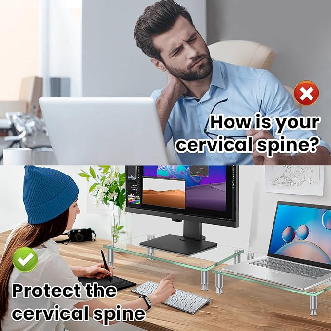 - ✅Ergonomic Viewing Position: The glass monitor stand risers includes 2 pack, unit size is 15(L) x 9.458(W) x 3.75(H) inch, clearance size between legs is 15(L) x9.45(W) x 3.75(H) inch; Legs height can get better viewing position, and help to reduce the neck and back strain.