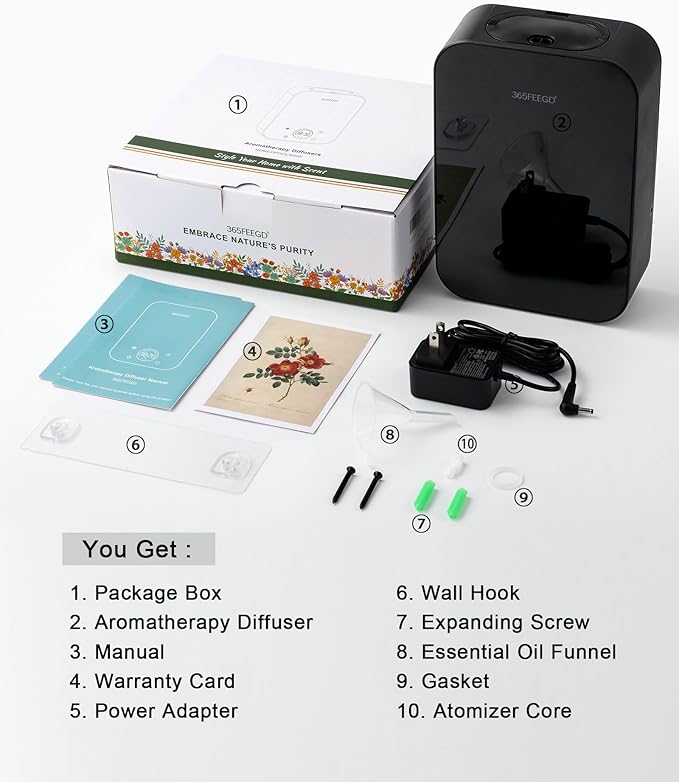 - You Get: 1* Waterless Oil Diffuser, 1* Power Adapter, 1* Wall Hook, 1* Atomizer Core, 1* Plastic Funnel, 1* Manual, 1* Warranty Card