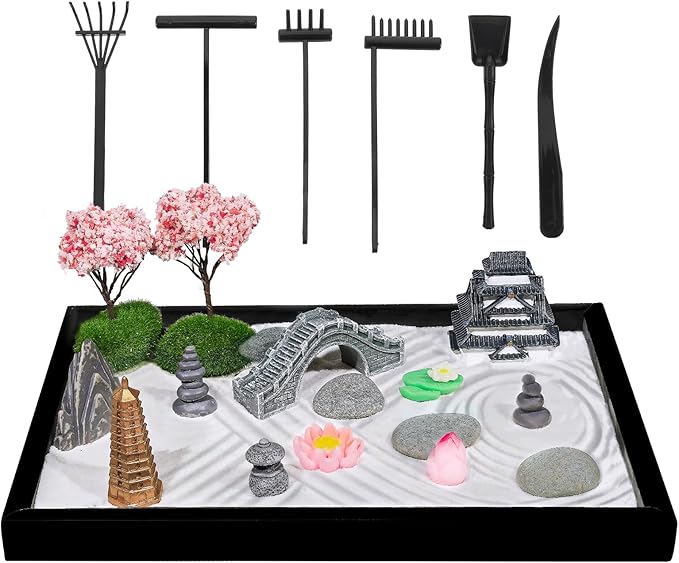 - Zen Garden Kit: Mini Japanese zen sand garden kit includes black wood tray 9.8 x 7 inches, white sand, 6 tools, 6 rocks, 1 resin Himeji castle, 11 figurines, 3 mini cherry blossom trees, 2 fake moss and so on, you can easily craft your own miniature zen garden