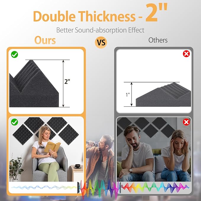 - 【Reduce Echo & Reverb Instantly】Each 2-inch thick panel is made from high-density foam to absorb unwanted sound waves, reducing echo and background noise for a cleaner, more focused audio experience.