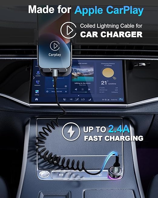 - iPhone Car Charger Cable Coiled: The coiled USB to Lightning Cables is designed with retractable spring design, no tangle, no knot, not taking up space and easy to carry and use. This iPhone cable features automatic retraction, saving space in the centre console and preventing clutter. Fully compatible with CarPlay and supporting fast charging.