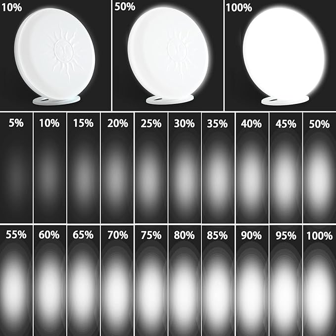 - Bright light therapy provides 3 kinds of fixed brightness 10%, 50%, 100% and 20 levels of brightness fine-tuning to achieve maximum comfort and personalization. The smooth dimming function allows you to easily adjust the brightness level from 10% to 100% just by pressing a button. Happy light lamp customize the most suitable light according to distance, environment and light sensitivity.