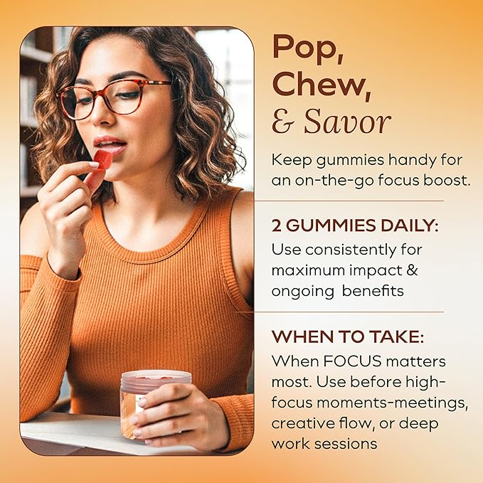 - Focus and Clarity: A powerful nootropic in these focus gummies, Lion’s Mane is known to support neurogenesis and mental sharpness, ideal for students, professionals, and creatives seeking better concentration and clarity.