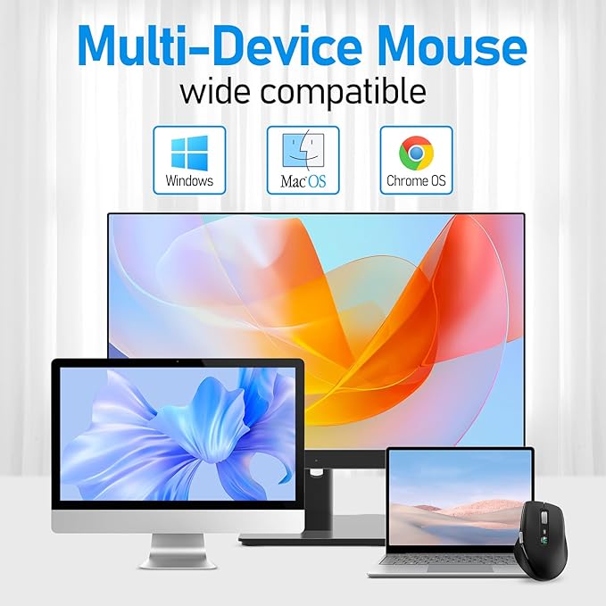 - Multi-device and Multi-OS: This mouse is able to connect to 3 devices (2.4G USB+ Bluetooth*2) . You can switch between 3 devices with a single button clicking.Compatible with Windows, Mac OS, Linux, IOS, Android, Chrome OS. Applicable to Computer, Laptop,Tablet, MacBook, All-in-one PC, Smartphone, iPad.