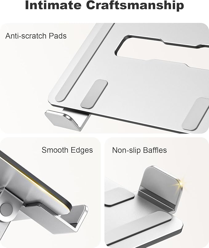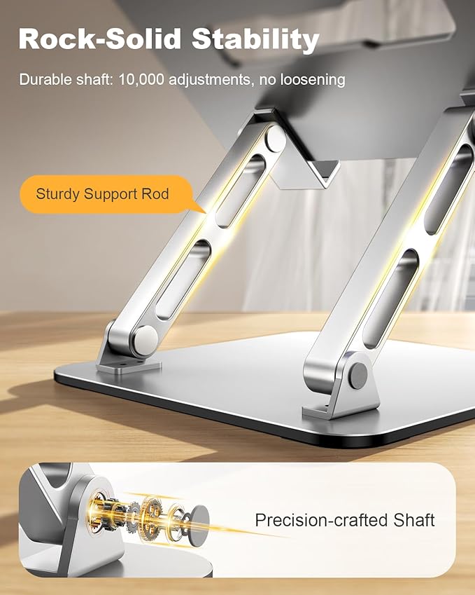 - 【Stable & Secure Support】Engineered with a dual rod support and industrial-grade bearings, this laptop stand for desk maintains military-grade stability through 10,000 adjustments. In addition, it features a non-slip silicone pad that protects the laptop from scratches and holds it in place. It is an indispensable assistant for programmers/designers.