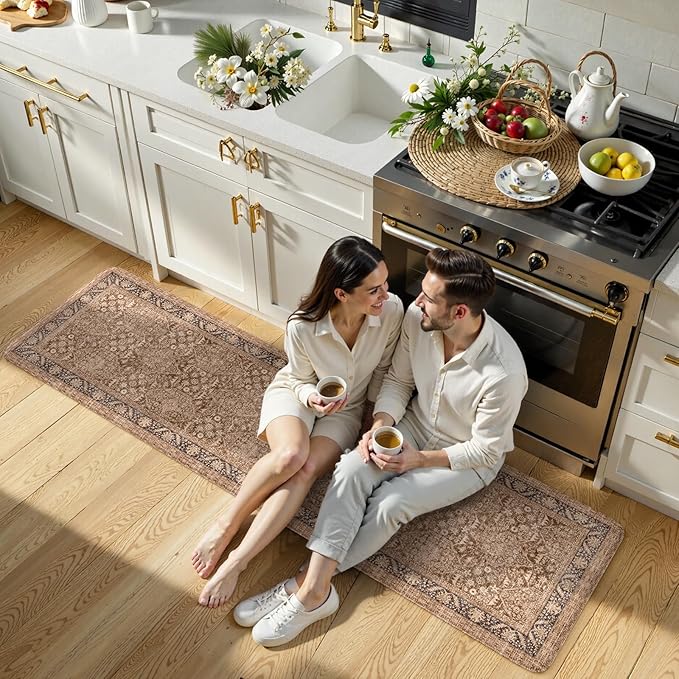 KIMODE Anti Fatigue Mats for Kitchen Floor, 20"x71" Boho Vintage Kitchen Runner Rug, Cushioned Floor Mat Non Slip, Memory Foam Standing Mat for Sink Laundry Office Desk Brown