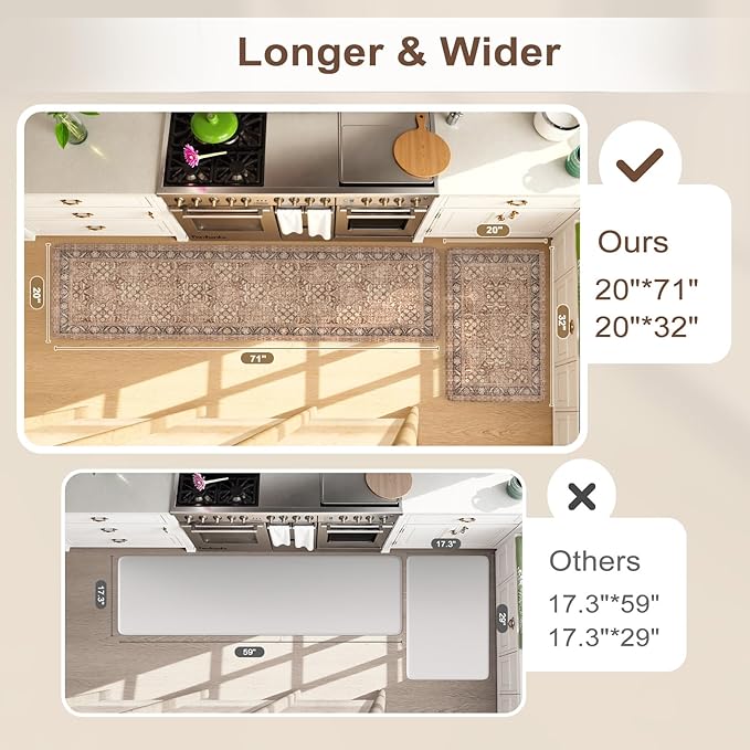 - Wider & Longer Kitchen Rugs 2PC:The set contains 2 rectangular kitchen mats measure 20"x71"+20"x32" which are wider than ordinary kitchen mats on the market.The mats are made of premium materials, which are friendly to your kids and pets