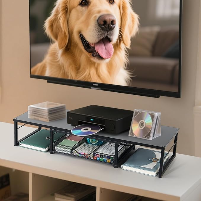 - 【 Dual Monitor Stand with Smart Storage】Clear workspace clutter effortlessly. The built-in drawer design neatly organizes desktop accessories and office supplies, keeping essentials clearly visible and within easy reach to boost your focus and productivity