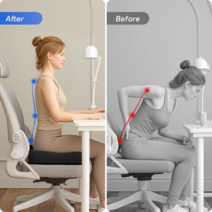 - 【Ergonomic Seat Cushion for Office Chair】Designed with orthopedic contours, this chair cushion for back pain provides full hip support and all-day sitting comfort. Perfect for office chair seat cushions, gaming chair cushions, or airplane seat cushions, it targets sciatica, tailbone pain, and butt cushion needs caused by prolonged sitting.