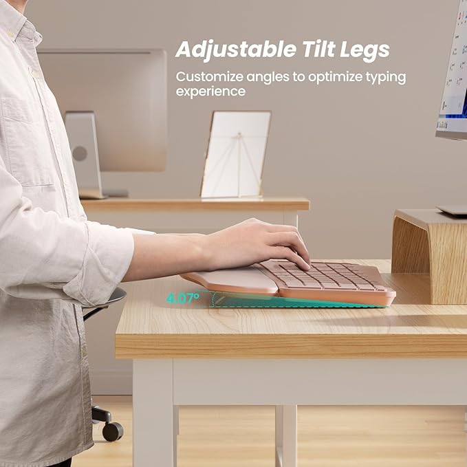 - Enhanced Wrist Comfort: Our keyboard includes a curved palm rest with a soft memory foam layer, offering superior wrist support and reducing wrist bending. Meanwhile, the adjustable tilt design allows for optimal positioning, ensuring your wrist remains relaxed and comfortable, whether you're seated or standing.