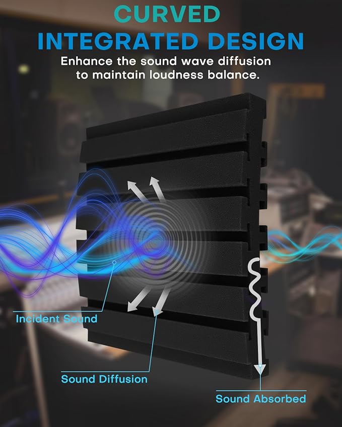 - PATENTED DESIGN: Engineered with advanced acoustic foam panels featuring a unique curved groove design, these panels offer enhanced noise absorption capabilities. Improve the indoor acoustic environment, mainly by diffusing and absorbing sound waves to reduce noise and echo. This type of foam often features specific geometric shapes, such as curved or wavy forms, to increase surface area and enhance the efficiency of sound wave contact with the material