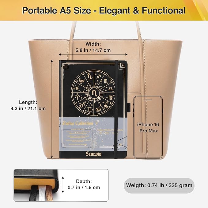 - Elegant & Sustainable Materials: Crafted with 160 FSC-certified, 100gsm cream-white pages and a premium vegan leather cover accented by a gold-foiled Scorpio motif.
