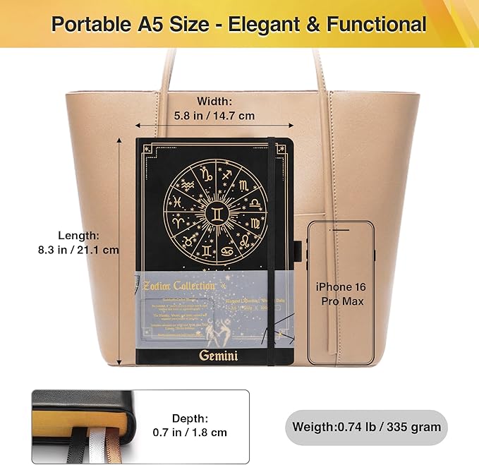 - Elegant & Sustainable Materials: Crafted with 160 FSC-certified, 100gsm cream-white pages and a premium vegan leather cover accented by a gold-foiled Gemini motif.