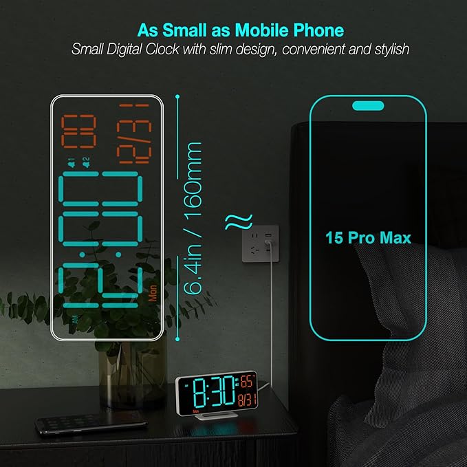 - [6.7in Desk Clock] This stylish small digital clock has 6.7-inch display, with auto/manual dimming, seconds or room temperature (℉ / ℃), day of the week, 12/24-hour format, date and dual alarms, it is also a fine digital calendar and cool digital clock for bedroom with orange and sky blue numbers, it's also a cool gift.