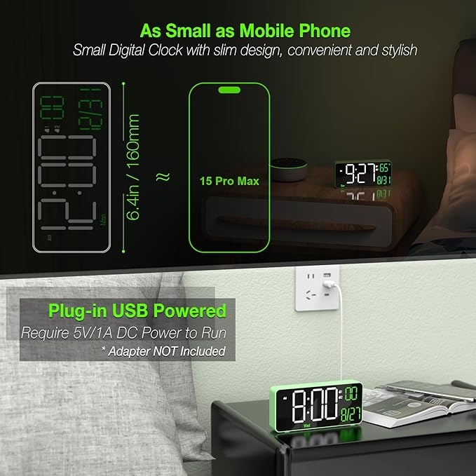 - [6.7in Digital Clock] This green desk clock features 6.7-inch multi-functional display, includes the Time, Date, Day of the Week, Seconds or room Temperature (℉ / ℃), Dual Alarms, 12/24-hour format, and Auto/Manual Dimming. It' a cool digital alarm clock for bedroom and modern digital calendar with clear numbers, it's also a cool gift.