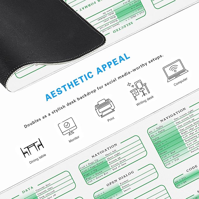 - ULTRA-SMOOTH SURFACE:This 31.5"x11.8" inch excel shortcuts mousepad offers ample workspace with a water-resistant leather surface, anti-slip base, and premium natural rubber. This excel pad is perfect as a mouse pad, writing pad, or stylish desk mat