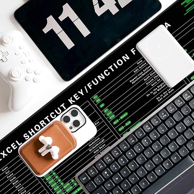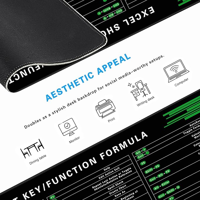 - ULTRA-SMOOTH SURFACE:This 31.5"x11.8" inch excel shortcuts mousepad offers ample workspace with a water-resistant leather surface, anti-slip base, and premium natural rubber. This excel pad is perfect as a mouse pad, writing pad, or stylish desk mat