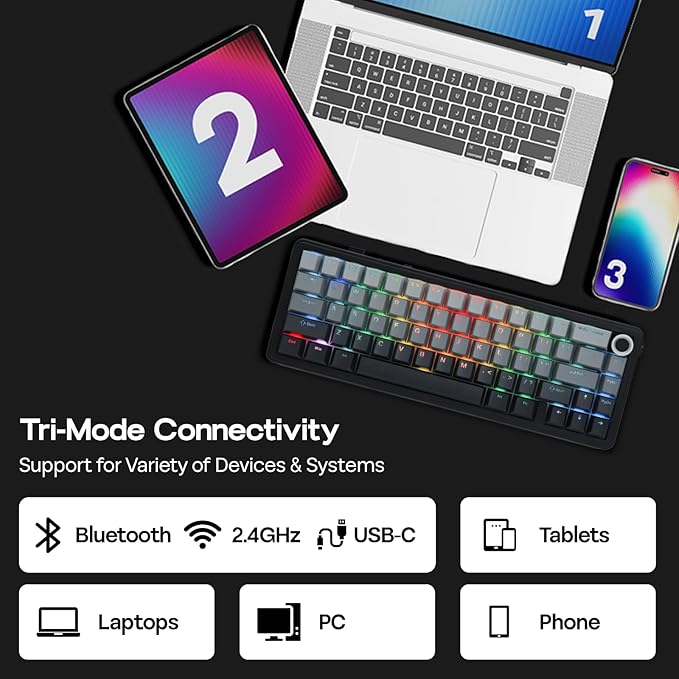 - WIRELESS CONNECTION, LIMITLESS CONTROL: Unlock the pinnacle of keyboard versatility and seamless control with our F65 PRO as true game-changer for streamlined workspace and desk top setup. Embrace the freedom of wireless connectivity, effortlessly switching between Bluetooth, 2.4GHz wireless, and wired modes to suit any setup or device, whether it's for your desktop, mac laptop, android tablet, or phone; and elevate your workflow with the intuitive knob control, enabling rapid adjustments to volume and backlight on the fly without complicate key string or drop down menu to keep you focused on the action.