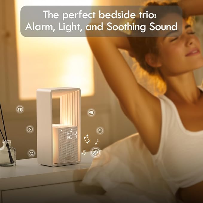 - Gentle Sunrise Wake-Up Light with Snooze - Wake up naturally with a simulated sunrise that begins 10 minutes before your alarm. The soft light gradually increases to gently bring you out of sleep—no more jarring alarms or groggy mornings.Need a few more minutes of rest? Hit snooze and sleep on.