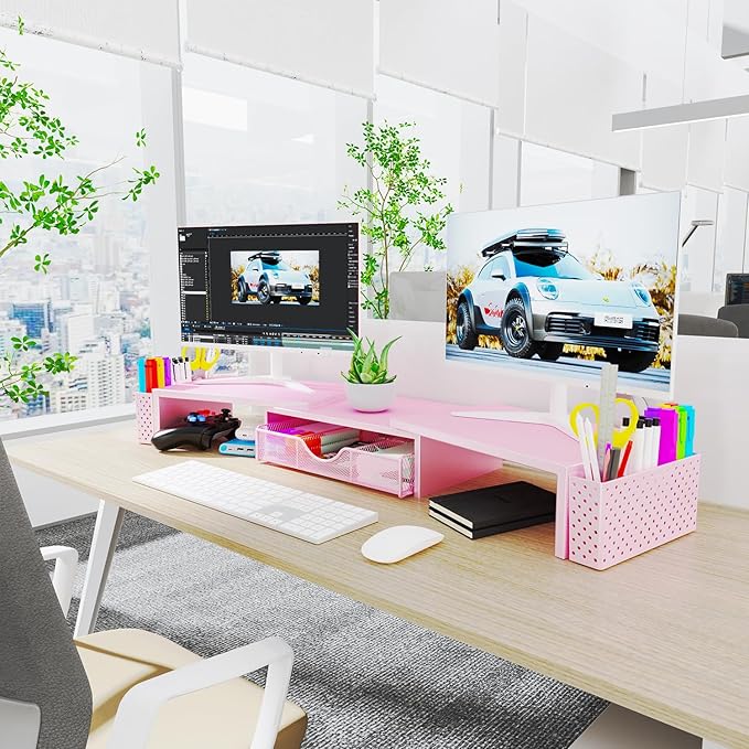 Spacrea Metal Desk Organizers and Accessories, Dual Monitor Stand Riser with Drawer and 2 Pen Holders, Desk Accessories & Workspace Desktop Organizers for Office Supplies (Pink)